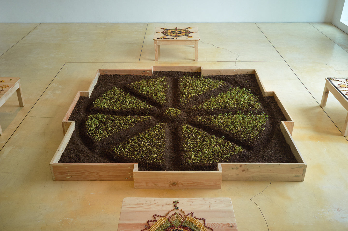 Emphasizing the notion of offering, this project would like to consider Arahmaiani’s work (a performance and an installation) as offerings to be presented within a temporary structure designed by Japanese architect Fumihiko Sano and inspired by Japanese teahouses. The work Memory of Nature (2010-ongoing) by Arahmaiani is connected to the Mandala and it is the result of an intensely research carried by the artist with the Tibetan monks. The Hindu Sanskrit origin of the word Mandala is a concentric diagram with spiritual and ritual significance; it means “essence,” “having” or “containing.” It can also be translated as “circle-circumference” or “completion.” In Bali, the Mandala is a possible representation of the universe. In this work Arahmaiani takes the shape from the basic forms/patterns of the Borobudur temple in Java in order to create Mandala-shaped sand paintings, following a technique commonly employed by Tibetan monks for special rituals. Originally conceived as a performance by Arahmaiani in collaboration with the musician Wukir Suryadi, Memory of Nature becomes later a participatory work in which the audience is invited to create new versions of Mandala using organic materials such as seeds and soil. A contemplative and meditative work, it evokes memories of the universe.