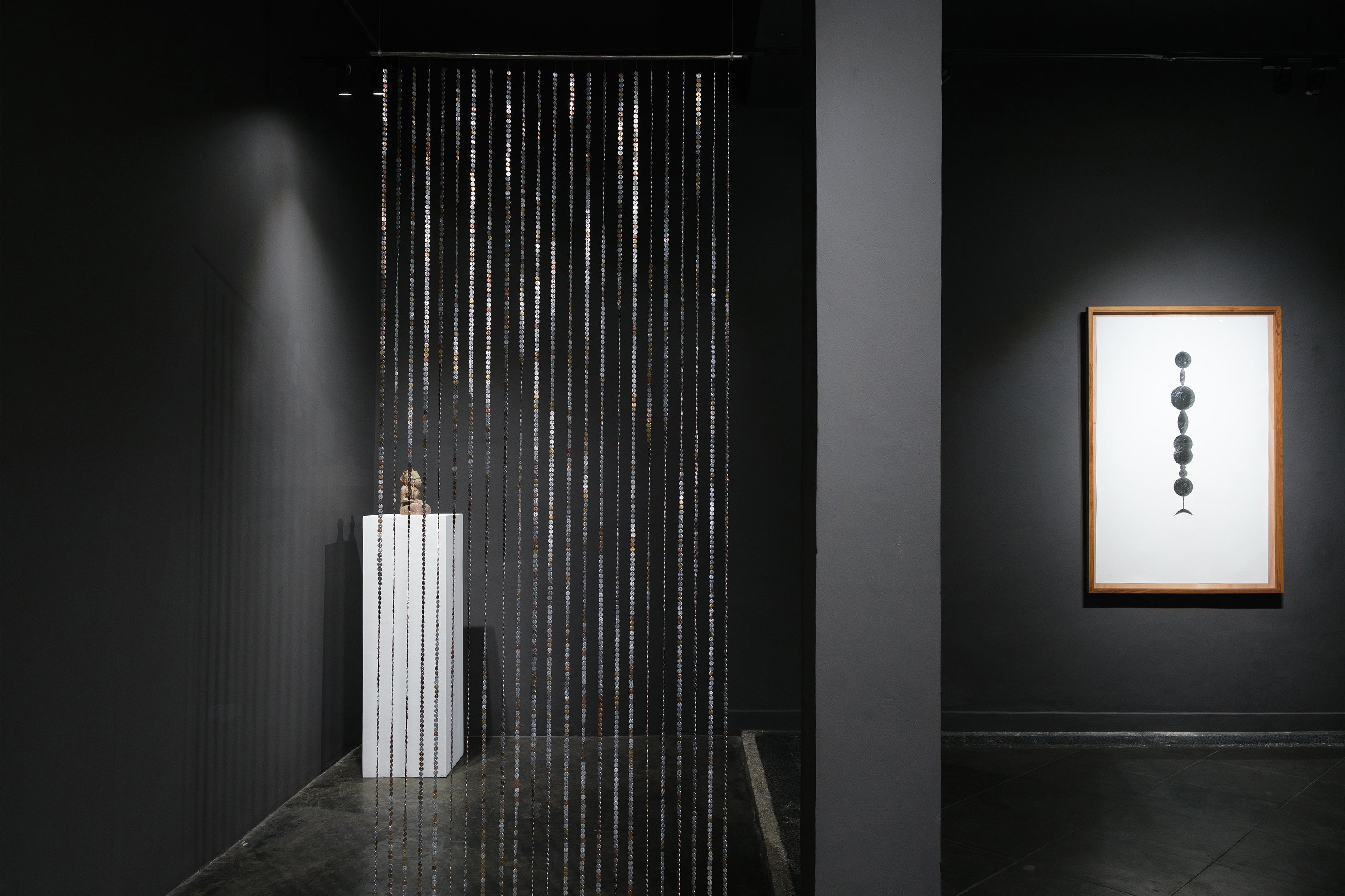 In the show Thousand Years in Silence the title operates as a mental framework for how the artworks interact with each other. They are connected through a complex underlying structure of thoughts that come out from the same source: the sacred fountains of Bali, where the artist literally collects most of his “art supplies”. The metal of collected wish coins physically forms the primary substance for all of Cassani’s three-dimensional works.