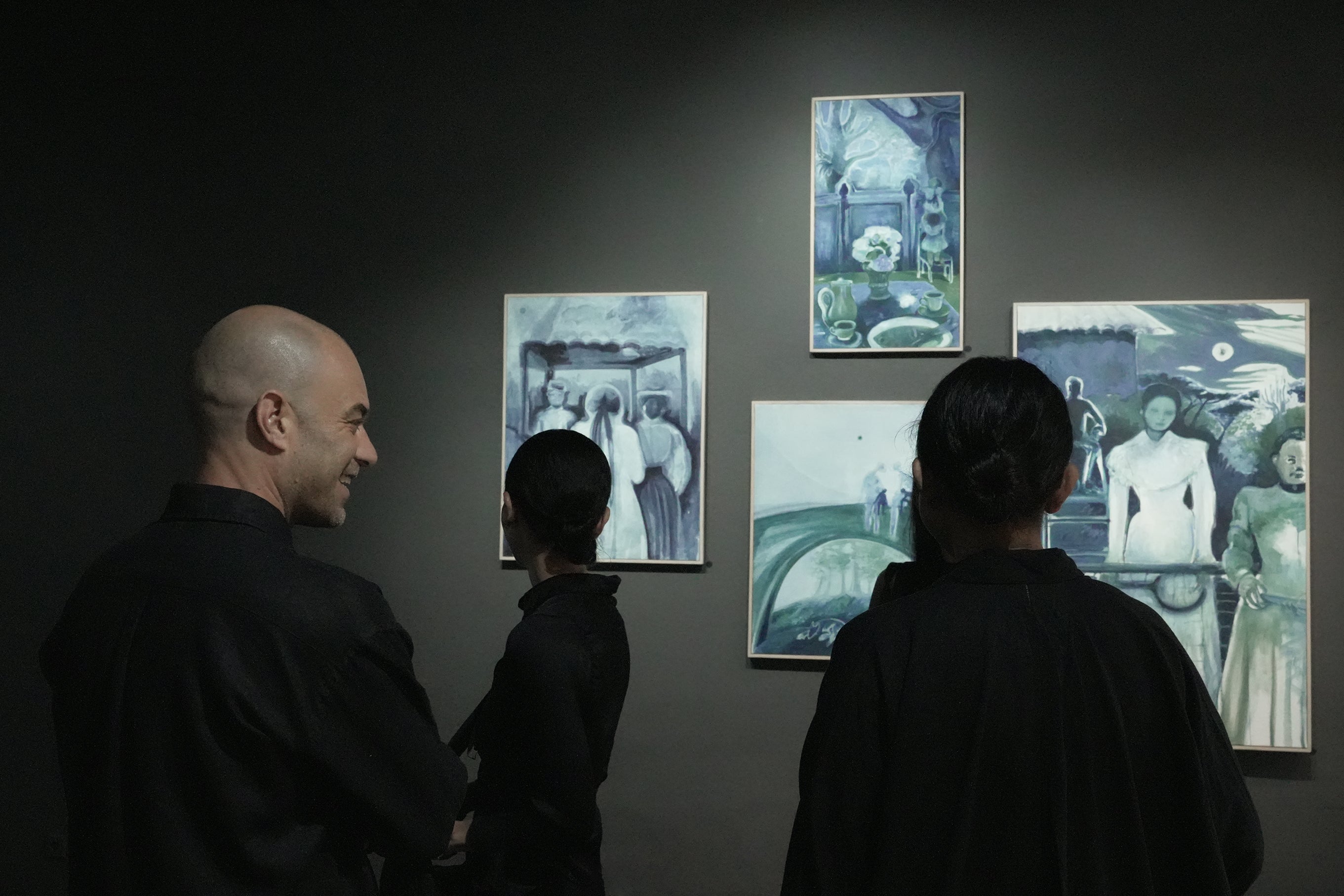 Purnama is derived from the Sanskrit word Pūrṇimā (पूिण%मा), meaning full moon. The curatorial foundation of the exhibition is a modestly sized painting by Mangku Muriati: Manusia Rembulan (Moon People) from 2015. The painting depicts four female figures dancing around a central moon.